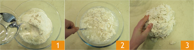 To prepare the basic pinsa dough, first put the pinsa flour and the crumbled fresh brewer's yeast in a large bowl. Also add 700 g of cold refrigerator water (about 34 fl oz / 3 cups) and stir with a spoon, until absorbed. Transfer the dough to a work surface and, without adding more flour, start kneading. Don't worry if at first the mixture looks very rough.