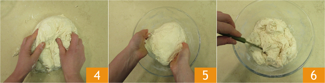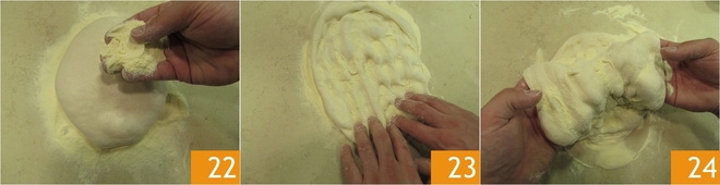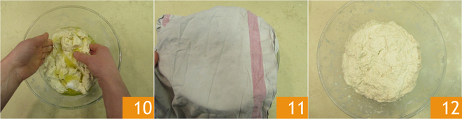 Knead for a long time until you obtain a smooth, compact consistency. Transfer the dough to a bowl and make 3 slashes with a knife: this helps the subsequent ingredients to be absorbed better.