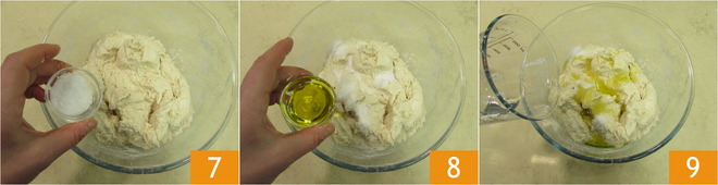 Then add the salt, the oil and the remaining 50 g of cold water; add this last amount little by little while continuing to knead (about 1.7 fl oz / roughly 3 1/3 tbsp).
