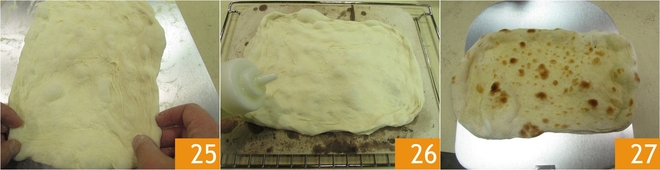 After the proofing time of the dough balls, take one and place it on a work surface generously sprinkled with semolina. Also dust the surface of the dough with semolina. Starting from the edge closest to you and moving upward, press lightly with your fingers to flatten the dough. Press with your fingers almost parallel to the work surface so as to distribute the air evenly. Shape it as rectangular/oval as possible. While you gently lift the dough, try to remove any excess semolina.