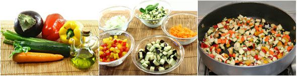 Clean the vegetables and cut them into small cubes; chop the spring onion and garlic clove and place them in a pan to brown with 4 tablespoons of extra virgin olive oil. Add the diced vegetables and sauté them for about 10 minutes, then add salt, pepper, and turn off the heat.