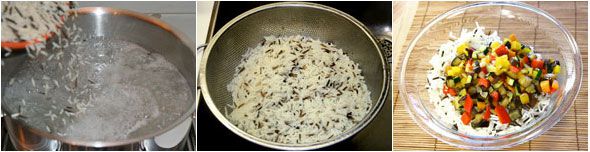 Rinse the rice under cold water; then boil it in salted water for about 12-15 minutes, drain it, and spread it out in a wide, shallow container to cool.
