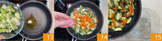 In a nonstick pan heat a drizzle of oil, then add the vegetables 13 and stir-fry over high heat for a few minutes, seasoning lightly 14. When they are browned but still crisp, set them aside 15.