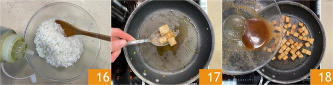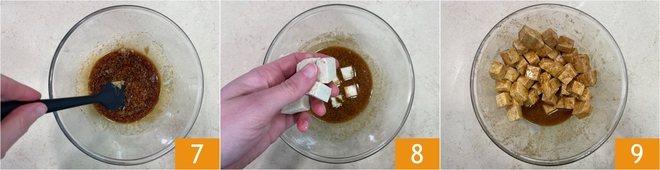 Mix the mixture well 7, then add the tofu cubes 8 and mix with your hands to coat them evenly 9. Let marinate while you continue with the rest of the recipe.