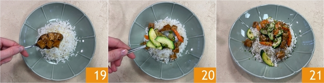 You're ready to plate: arrange the rice as a base, then add the tofu with its sauce 19 and the vegetables 20. Finish with black and white sesame seeds and chopped chives. Your basmati rice with soy-marinated tofu and stir-fried vegetables is ready to be enjoyed 21!