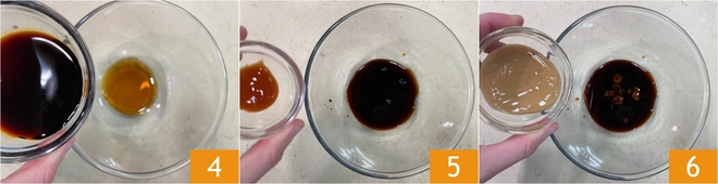 Add the soy sauce 4, the sriracha sauce 5 and the peanut butter 6.