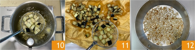 Heat the seed oil to a temperature of 356°F and fry a few eggplants at a time for about 3-4 minutes 10. Drain the eggplants on paper towels 11 and set aside. Put the pine nuts in a preheated pan and toast them over medium heat for about 5 minutes, stirring often. When they are colored, turn off the heat and set aside 12.