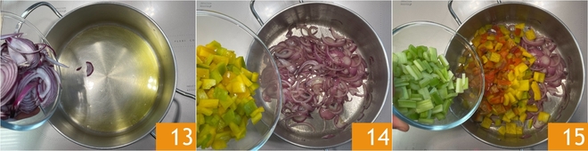 Proceed to the preparation of the caponata: heat a generous amount of oil in a large saucepan, then add the onions 13 and cook over medium heat for 3 minutes. Add the peppers 14 and celery 15 and sauté for 5 minutes.