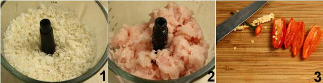To prepare the aromatic chicken sticks, start by chopping the bread crumbs in a blender 1 and separately 400 grams (about 14 oz) of chicken breast 2, set them aside. Then remove the seeds from the fresh chilies 3