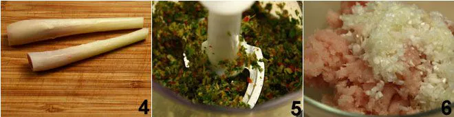 and trim the ends of the lemongrass sticks 4. Finely chop them in a blender with ginger and mint and coriander leaves 5. Wash the green onions and finely chop them with a sharp knife. In a bowl, put the minced chicken and incorporate the green onions 6,