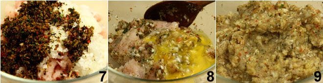 the mixture of spices and herbs 7, the egg that you have previously beaten 8, and the bread crumbs processed in the blender. Mix the ingredients well 9 and finally adjust the salt.