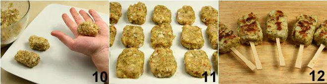 With wet hands (keep a bowl of warm water at hand), make small cylinders with the mixture, place them on a plate and slightly flatten them with your fingers 10, obtaining the shape of small bricks. Place the sticks in the fridge for 10/15 minutes 11. Heat a griddle/pan over medium heat, place the chicken sticks on it and cook them for about 10 minutes, turning them often to prevent sticking. Optionally, lightly grease the pan with some oil. Serve the aromatic chicken sticks with toothpicks 12 as an appetizer, accompanied by yogurt sauce, soy sauce, or sweet chili sauce.