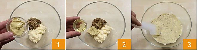 To prepare chicken sticks with mustard sauce, start with the sauce: first add Dijon mustard to the mayonnaise, then the milder mustard 1, and finally the honey 2. Mix with a spatula or spoon to obtain a homogeneous mixture 3 and cover the bowl with plastic wrap. Then place the bowl in the refrigerator.