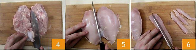 Clean the chicken breast with a knife from any fat or internal cartilage 4 turn it over with the inner side resting on the cutting board 5, then cut it into slices 1/2 inch thick, which you will reduce into square-section strips 6.