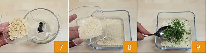 Coarsely chop the almonds, using a food processor 7. In a bowl, add the chopped almonds, breadcrumbs, grated cheese 8, pepper, and chopped parsley 9.