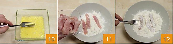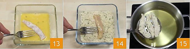 Once floured, dip them in the beaten egg 13 and then in the breading 14. In a pot, heat the oil for a few minutes. To know when it's hot enough, drop a little breadcrumb; if it sizzles, then immerse the sticks 15.