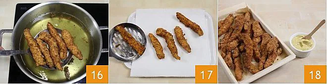 Cook the chicken sticks until they are golden brown 16. Alternatively, prepare the chicken sticks in the oven, baking them for 5 minutes at 480°F in a static oven (4 minutes at 450°F if using a convection oven) and finish cooking with 5 minutes of broil. Place the cooked sticks on a tray lined with paper towels 17. Remove the sauce from the refrigerator and place it in a small bowl, and your chicken sticks with mustard sauce are ready to be enjoyed 18.
