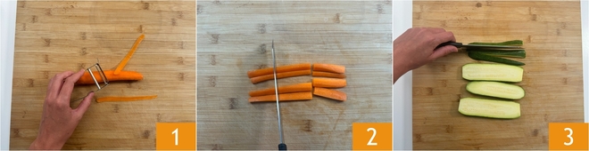To prepare the battered vegetables, first wash all the vegetables and dry them. Take the carrots, peel them 1 and trim the ends 2. Then cut them into sticks about 5/8 inch thick and about 1 5/8–2 inches long. Move on to the zucchini: cut them first into slices and then into strips about 5/8 inch thick 3.
