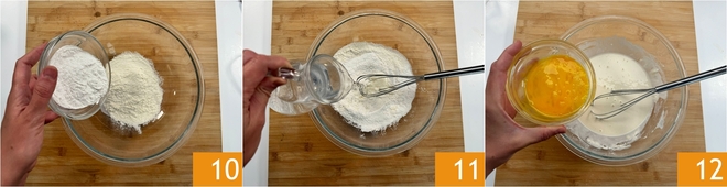 Heat plenty of neutral vegetable oil in a pot, monitoring the temperature with a proper thermometer, which should reach 338°F. Meanwhile, prepare the batter. Pour the two flours into a bowl 10, add the water 11 and the previously beaten egg 12.