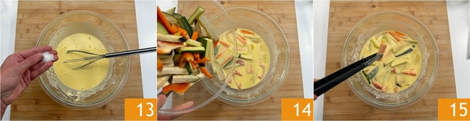 Whisk well and add a pinch of salt 13. You will obtain a smooth batter, fairly fluid and not very thick. Add half of the vegetables (initially just half, then as they are used up you can add the others) 14 and mix well so they are coated with the batter. When the oil reaches the correct temperature, lift the vegetables one at a time with tongs 15.