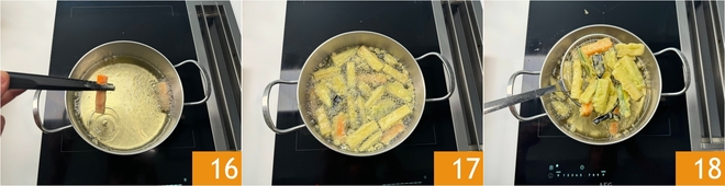 Immerse them in the hot oil a few at a time, so as not to lower the oil temperature too much 16. Cook for a few minutes until they are nicely golden 17, then use a slotted spoon to drain them from the oil 18.