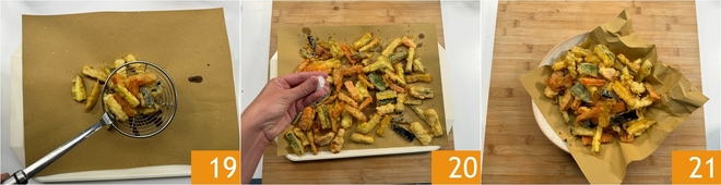 Transfer to a tray lined with paper towels 19 and continue cooking the other battered vegetables. Once all are fried, season with salt to taste 20 and serve them very hot 21.