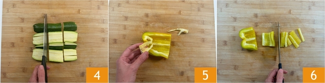 Then cut sticks the same size as the carrots 4. Move on to the yellow bell peppers: cut them in half and remove the seeds and inner membranes 5. From these, cut sticks the same size as the zucchini and carrots 6.