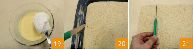 add it in three batches to the cream when it is completely cold 19, mixing from top to bottom to avoid deflating it. Retrieve the biscuit from the oven, gently detach the edges from the baking sheet using the blade of a small knife 20, then divide it into rectangles about 8 inches on the side (they should be slightly smaller than the loaf pan) 21;