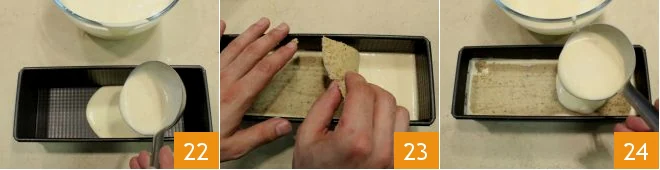 take a loaf pan 8.5x3.5 inches and pour the Bavarian into it using a ladle 22 until just under half of the pan. Gently place a rectangle of biscuit on top of the Bavarian, unrolling it gently 23; finish pouring the Bavarian 34