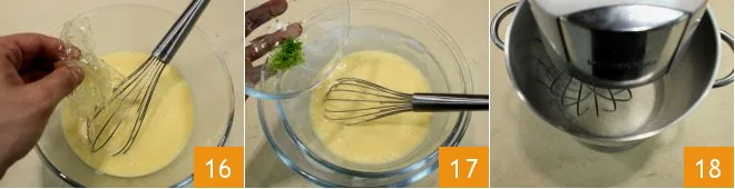 and collect it in a bowl, add the well-drained gelatin 16, and mix to completely dissolve it in the still hot cream. Once the gelatin is completely dissolved, place the bowl in a larger one containing ice (this process is used to quickly cool the cream while maintaining its consistency), also add the grated zest of 1 lime 17; Whip the heavy cream with a stand mixer fitted with whisks 18 or an electric mixer;