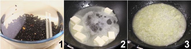 To prepare the bean cream, soak the beans in plenty of cold water for 12 hours (it would be better to soak them the night before, leaving them in water overnight) 1. After the soaking time, rinse the beans and drain them. Continuing with the preparation of our bean cream, clean and peel the onion and garlic, chop them, and place them in a pan with the melted butter 2 to soften 3;