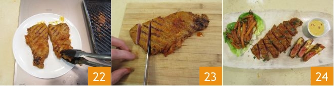 As soon as the meat is grilled on the other side 22, transfer it to a cutting board and cut it into strips 23. Arrange the carrots on a lettuce leaf, sprinkle the meat with chopped parsley, and serve with the coconut milk sauce 34.