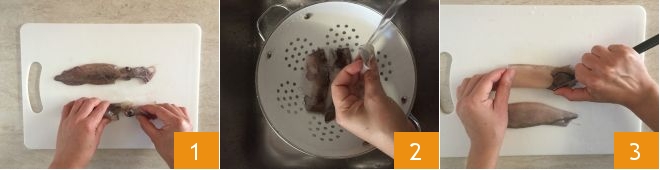 To prepare the beer-battered fried calamari, first, clean the calamari. Lay them on a cutting board and detach the head from the mantle with your hands 1. Then remove the transparent cartilage quill from the latter 2 and rinse it well under running water 2. Transfer them back to a cutting board and gently remove the skin with a small knife 3.