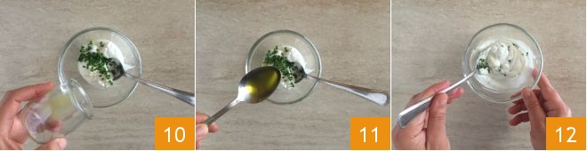 Set the calamari aside and prepare the accompanying sauce. Pour the Greek yogurt into a bowl 7, add the chopped chives 8, the lime zest 9