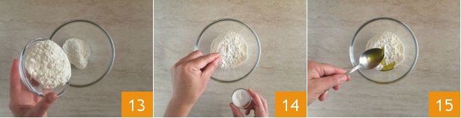 Heat the oil and in the meantime prepare the batter by pouring the flour into a bowl 13, add a pinch of salt 14 and a tablespoon of oil 15.