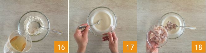 Add the beer 16 and stir until you get a smooth batter 17. Then pour the well-drained calamari inside 18 and mix everything to ensure the batter adheres perfectly.
