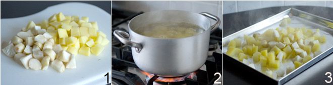 Peel, wash, and cut the potatoes and Jerusalem artichokes into 3/4 inch pieces 1. In a large pot, boil some water with salt; when it reaches a boil, add the Jerusalem artichokes and cook for 5 minutes. After 5 minutes, add the potatoes and cook everything for another 5 minutes 2. Preheat the oven to 350°F. Drain the potatoes and Jerusalem artichokes. Line a baking tray with parchment paper, add the potatoes and Jerusalem artichokes 3, and drizzle generously with olive oil. Bake for 60 minutes, shaking the tray occasionally to prevent sticking.