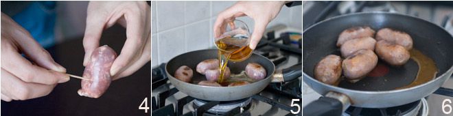 After this time, sprinkle the tubers with coarse salt and add the washed rosemary needles. Increase the oven temperature to 400°F and let the tubers brown. Meanwhile, prepare the verzini: prick them with a toothpick 4, brown them in a pan with a drizzle of olive oil until golden on both sides. Then add the beer 5 and cook over low heat until the beer has absorbed and started to caramelize. At this point (be careful as it burns very easily), add 3.4 oz of hot water and shake the pan to create a very flavorful sauce 6. Serve the verzini hot with their sauce, accompanied by the roasted potatoes and Jerusalem artichokes.