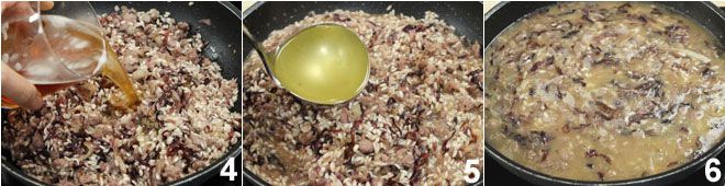 To prepare the beer risotto with radicchio and sausage, start by finely chopping the radicchio and dicing the onion. Put the oil and butter in a pan, let it melt, then add the onion and let it soften over low heat for 10-15 minutes. Add the crumbled sausage 1 and let it brown, then add the radicchio 2 and let it wilt over gentle heat, stirring occasionally. Once the radicchio is wilted, add the rice 3 and let it toast for a couple of minutes