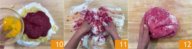 Mash the cooled potatoes in the center of the flour (the skin will remain inside the potato ricer) 7, then add the beetroot cream 8 and a pinch of salt 9.