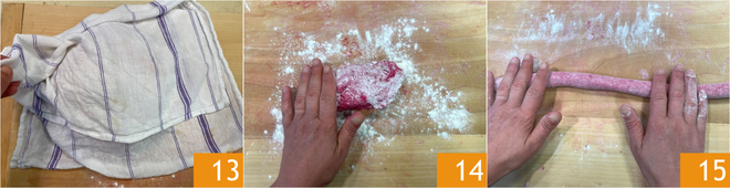 Form a ball and cover it with a cloth 13. Take a portion at a time and sprinkle it with semolina 14, then form a log 15.