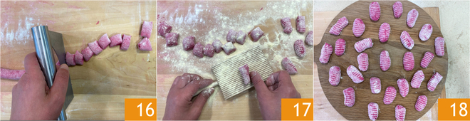 Cut the logs into pieces about 2 cm (approximately 0.79 inches) using a dough scraper 16. Roll each piece over a gnocchi board, applying light pressure with your thumb 17; if you don't have a gnocchi board, you can use the tines of a fork. Arrange the beet gnocchi on a tray sprinkled with semolina 18.