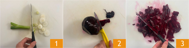To prepare the beetroot and gorgonzola pasta, clean and slice the scallion 1. Peel 2 and cut the pre-cooked beetroot into pieces 3.