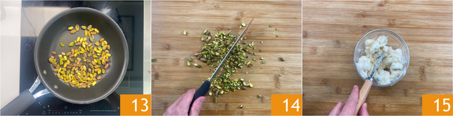Toast the pistachios in a pan 13 and then coarsely chop them 14. Set aside. Soften the gorgonzola in a bowl by mashing it with a fork 15.