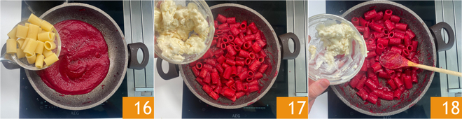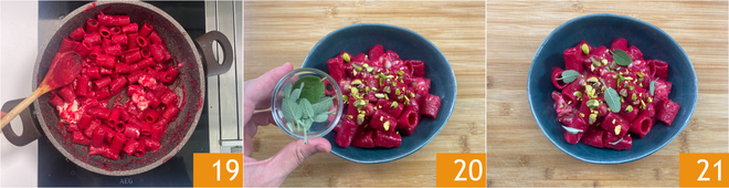 Mix briefly 19, so as not to completely melt the cheese. Plate with chopped pistachios and sage leaves 20. Serve the beetroot and gorgonzola pasta immediately 21.