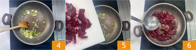 In the pan, sauté the scallion rings in oil 4. Add the beetroot 5. Salt and sauté for a few minutes, then add a ladle of water 6 and cook for 20 minutes, adding more water if necessary.