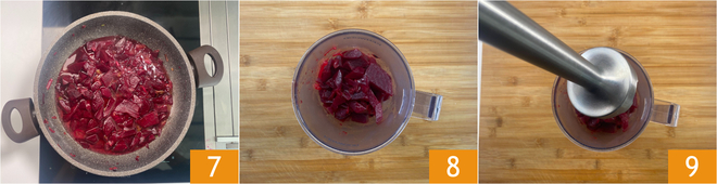Once the cream is ready 7, transfer it to a tall container 8 and blend very finely with an immersion blender 9, adding water as needed.