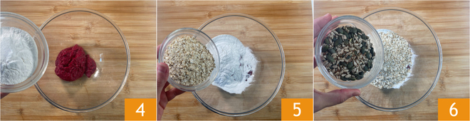 Pour the puree into a bowl and add rice flour 4, rolled oats 5, seeds 6, and salt.