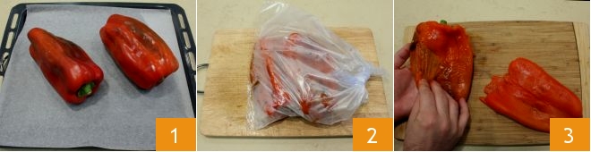To prepare the bell pepper pesto, start by roasting the peppers in the oven to make peeling easier: place the whole, previously washed red peppers on a baking sheet lined with parchment paper; bake them in a preheated static oven at 428°F for 20-25 minutes. Once cooked 1, place them in a food-safe bag 2 for at least 15 minutes, then peel them 3.