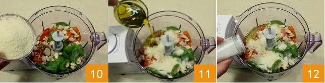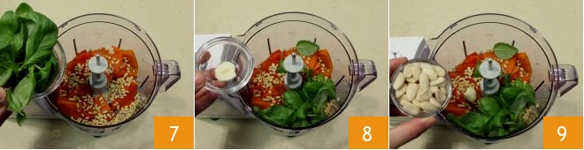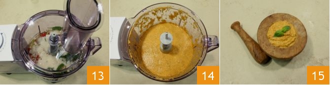 then start the mixer 13 and blend everything until you get a smooth mixture 14. Your bell pepper pesto is ready to be used 15 as a seasoning for first courses or to accompany toasted bread.